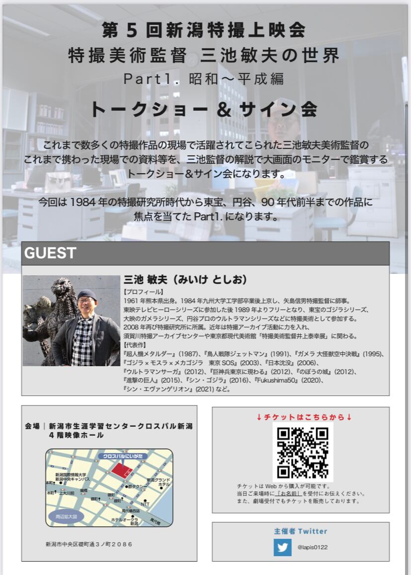 特撮美術監督 三池敏夫氏のこれまで携わってきた特撮研究所時代、平成ゴジラ、平成ガメラ(今回は1984年〜1995年頃)の秘蔵資料を三池氏の解説を交えたトークイベントになります